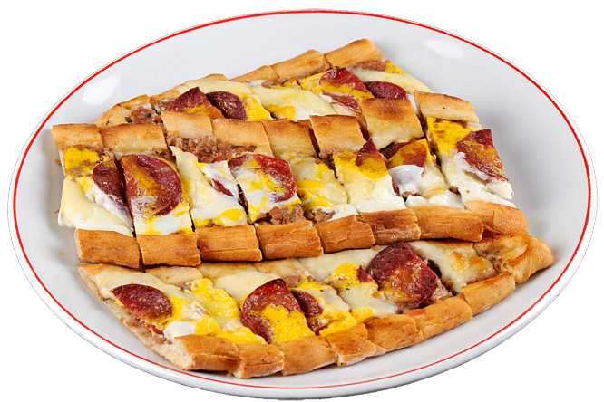 İncecik açılmış nefis ulus pide hamurunun üzerine % 100 dana kıyması, soğan, domates, maydonoz ve enfes baharatıyla beraber sucuk, salam, sosis ve taze gerçek sütten kaşarın eşlik etmesi.